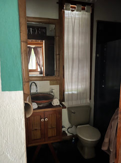 The wooden house is the apartment at the upper level. It’s split over 2 floors. On the first floor, it has a balcony, a fully equipped kitchen, two small bathrooms (one with a shower with hot water and one without shower) and a living room.
